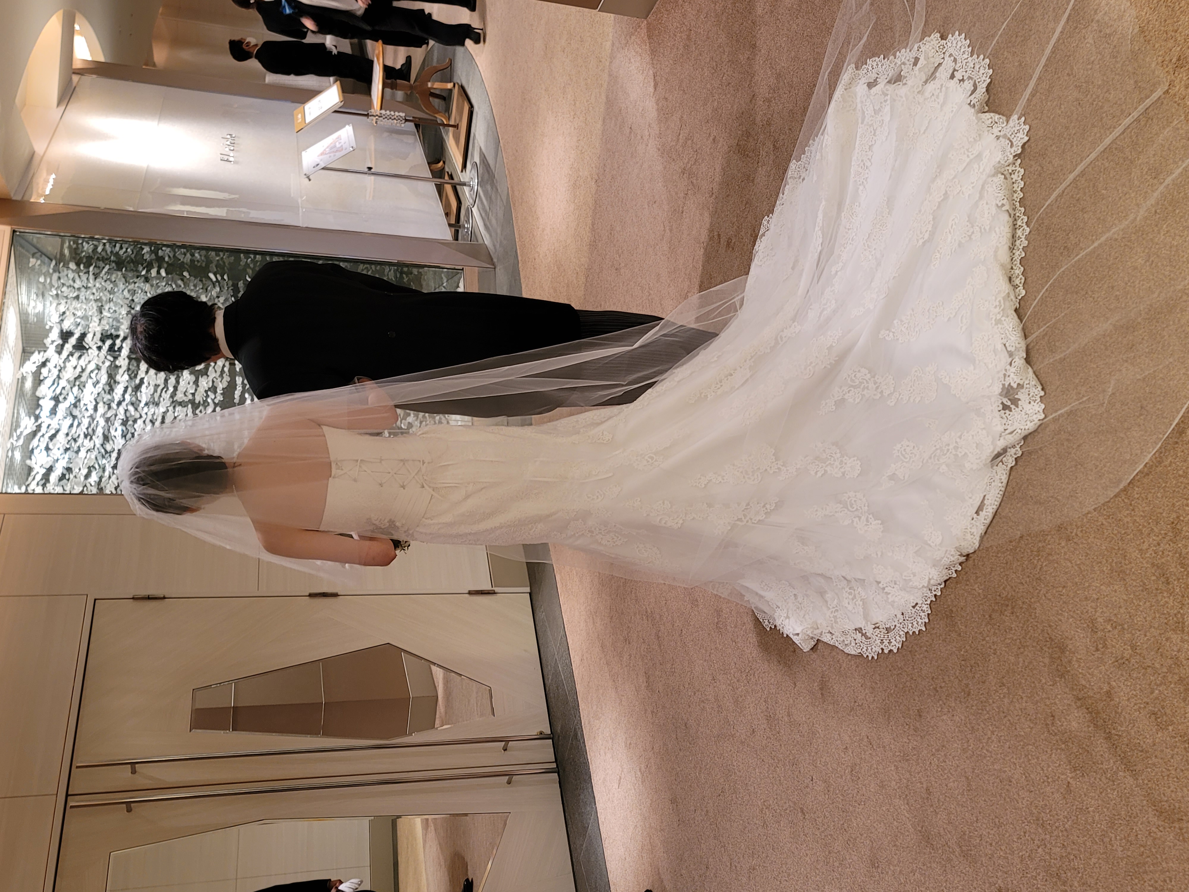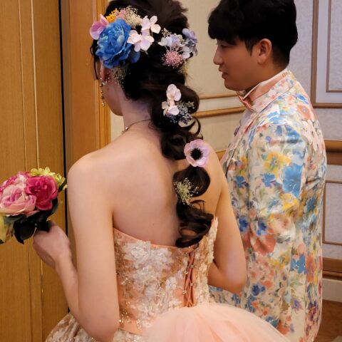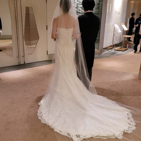 マーメイドラインがとてもお似合いの新婦様です。新郎様のタキシードに合わせて 髪飾りをお花にされました❤
