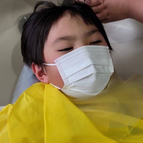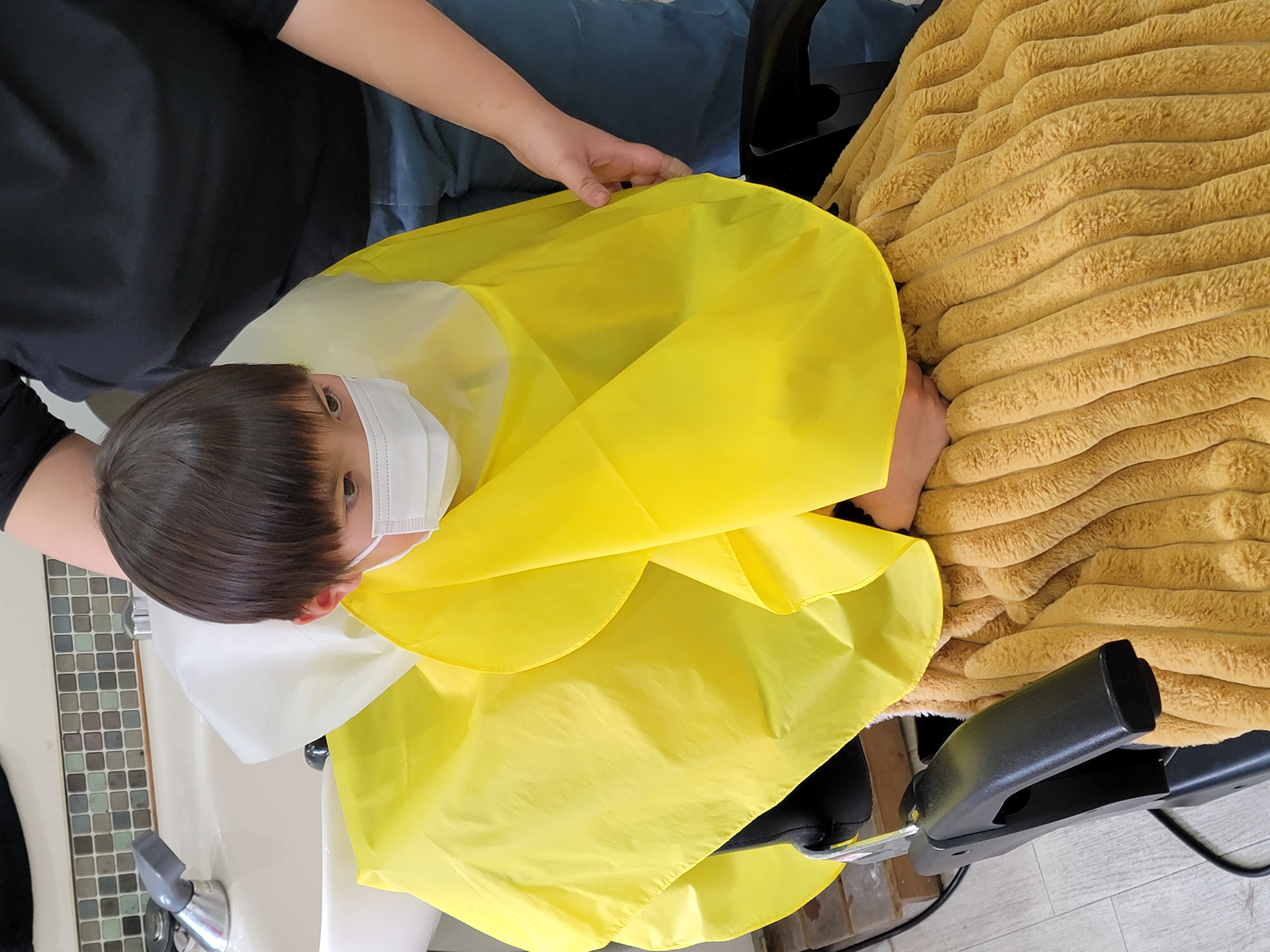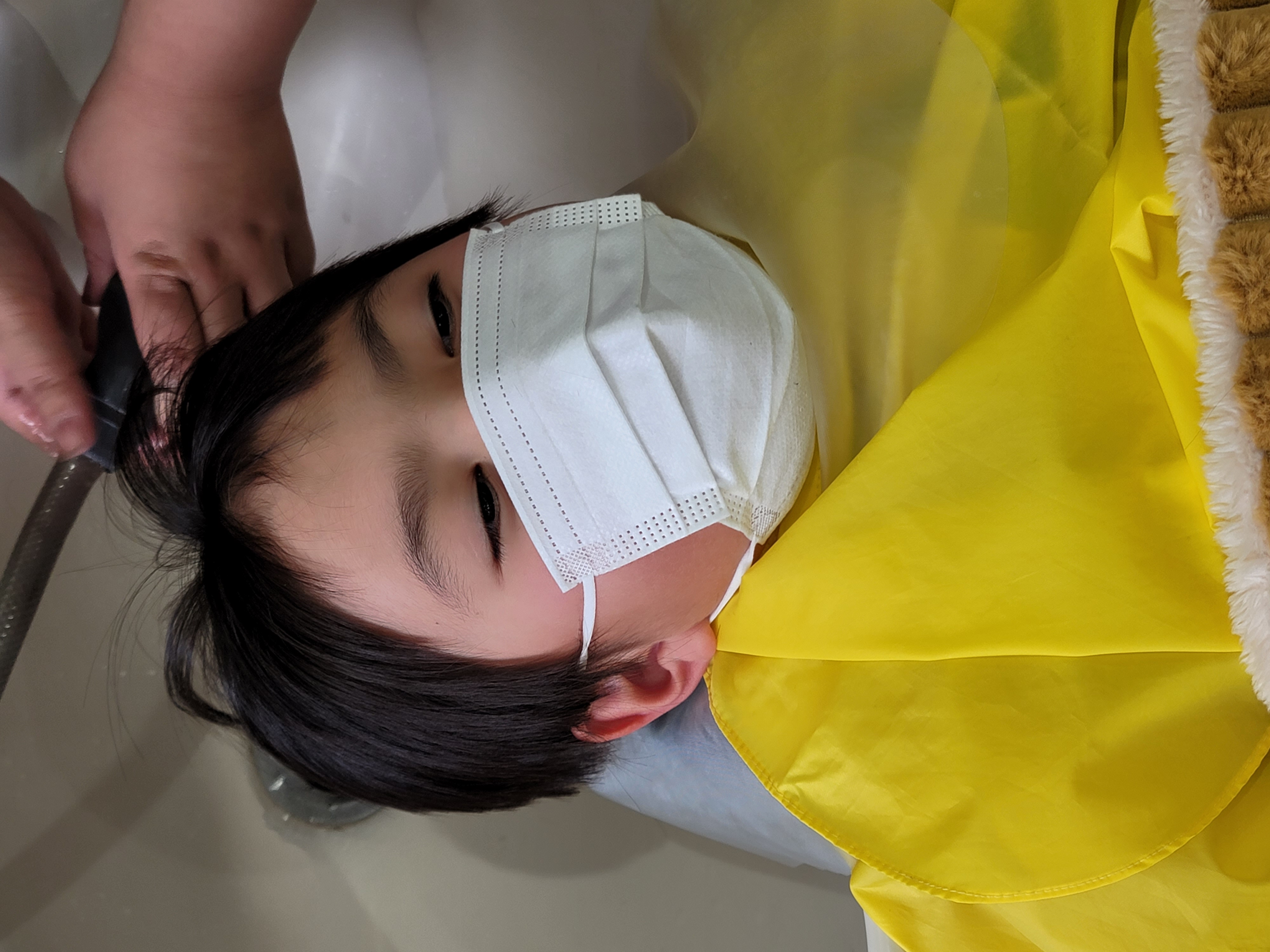『ママー‼シャンプーする時 靴脱いでいい❓ 』・・・とママに聞いて靴を脱いでリラックス!   シャンプーをしてもらってました。😆😆